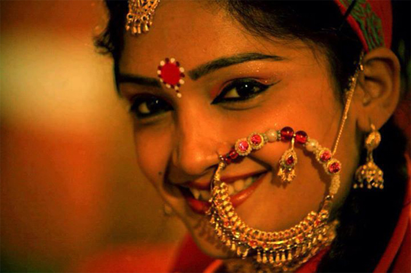 A married woman was supposed to wear hansuli (silver ornament) worn around the neck, guloband (resembles the contemporary choker), black beads and silver necklace called chareu, silver payal, silver necklace, silver dhagula (bracelet) and bichuye (toe rings). Sindoor along with bindi was also mandatory for a married woman. Even today, a Gulaband is a distinct feature of a married woman. It is designed on a maroon or blue band with gold square pieces arranged on it.